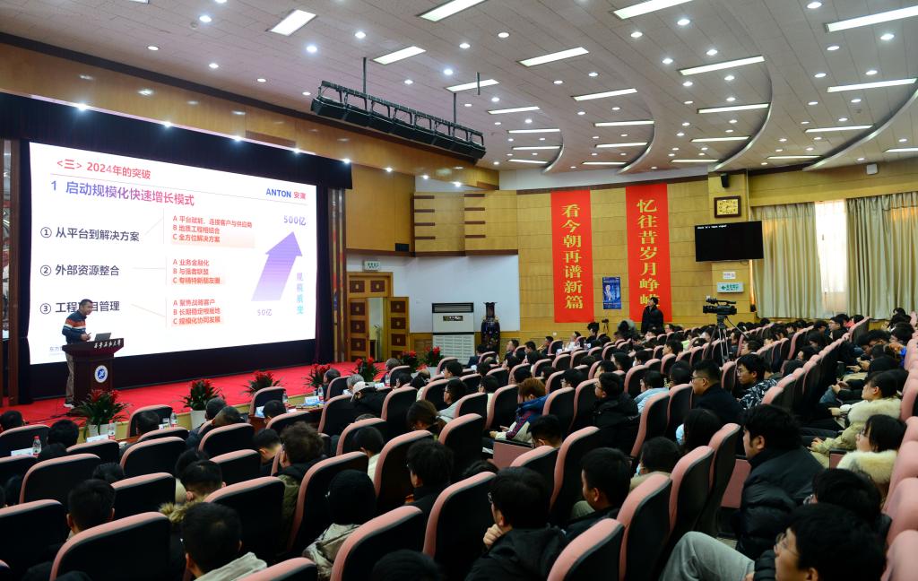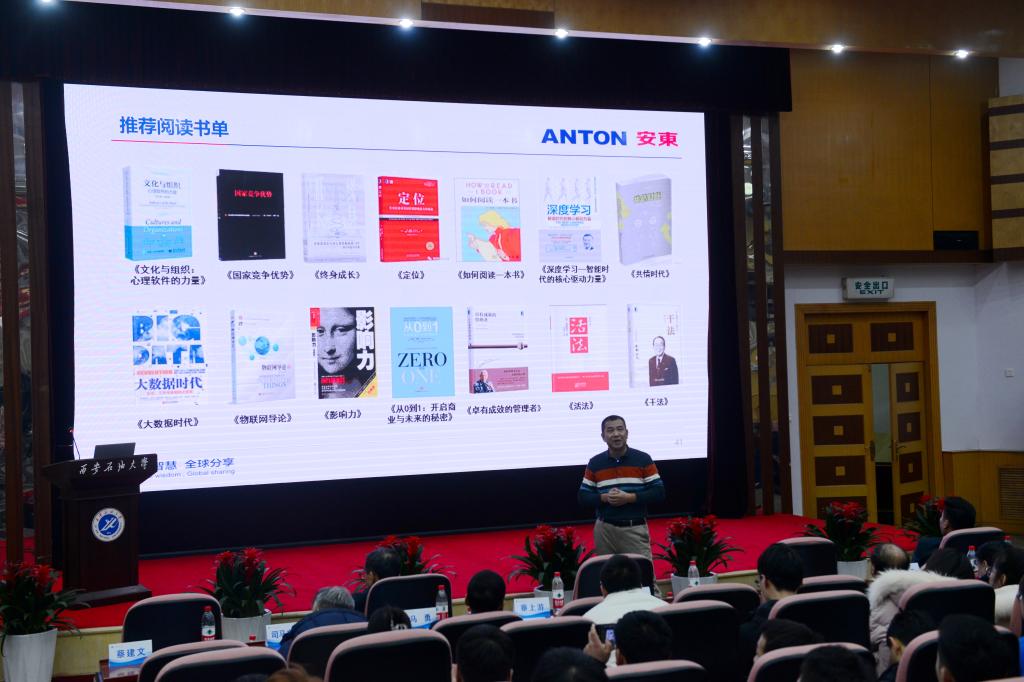 捐贈儀式后,羅林以《新時代,新物種,走在時代前列—創造偉大的公司,培養偉大的人才》為題為同學們作了一場精彩報告。他從安東集團的經營理念創新、產業布局創新、商務模式創新、技術改革創新、人才賦能創新、企業文化沉淀等六個方面介紹了安東石油服務集團的創新發展歷程,分享了艱苦創業如何不斷突破新的邊界、不斷走出舒適區和人才快速成長的基本原理等內容。