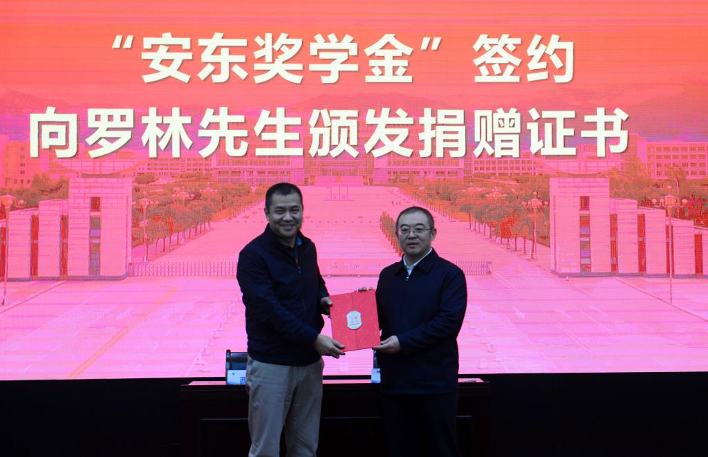會上,常江向羅林頒發了捐贈證書,張木代表學校與安東油田服務集團副總裁王照周共同簽署了捐贈協議。