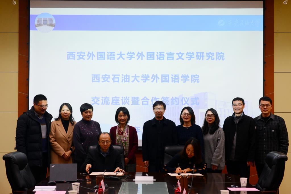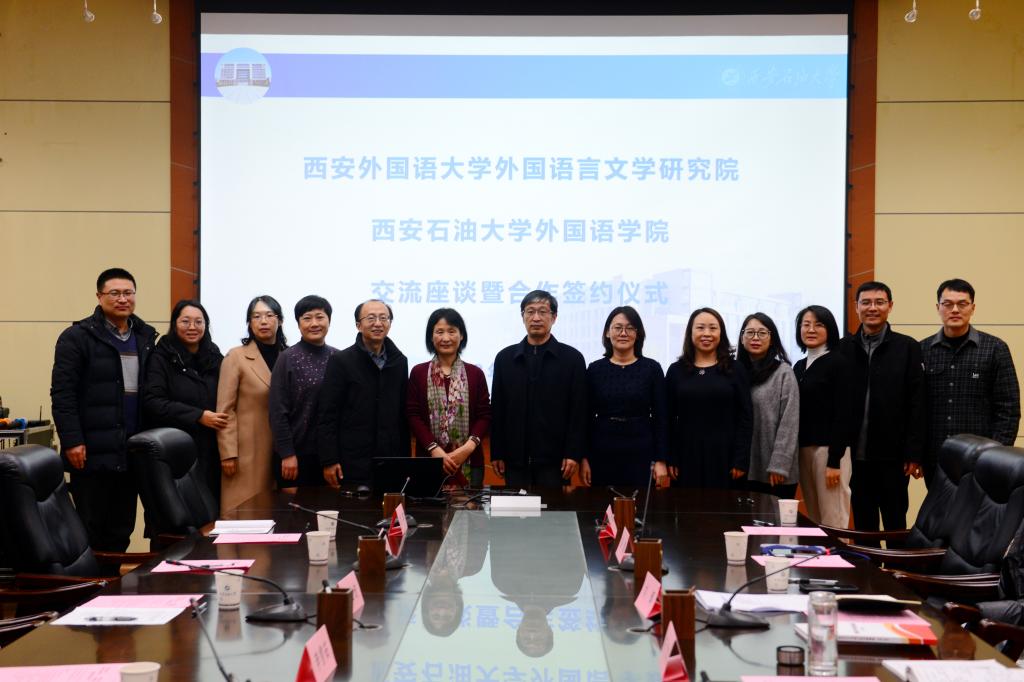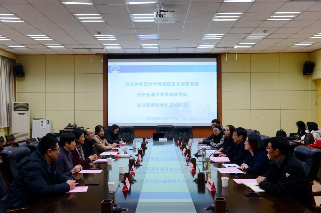 我校外國語學院黨委書記田虹霞介紹了學院的基本情況,著重就學院近年來的教學科研、師資隊伍、人才培養、社會服務等情況進行交流。西安外國語大學外國語言文學研究院院長黃立波介紹了研究院基本情況及近3年取得的重要學術成果。雙方代表圍繞教育教學、科學研究、人才培養等方面的合作展開熱烈討論與交流。