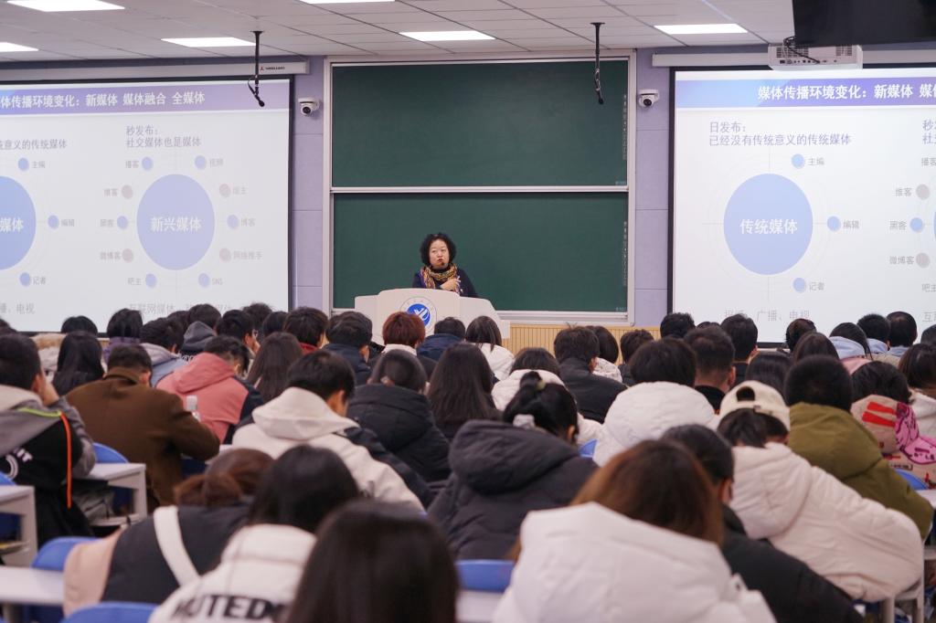 12月13日下午,新聞宣傳工作能力提升培訓班第二講在鄠邑校區博覽樓108教室舉辦。西北大學新媒體研究院院長韓雋教授應邀來校作題為《全媒體時代下高校新聞報道形態創新》專題講座,學校宣傳思想文化工作者、人文學院教師、大學生新聞社及學通社130余名師生參加了報告會。