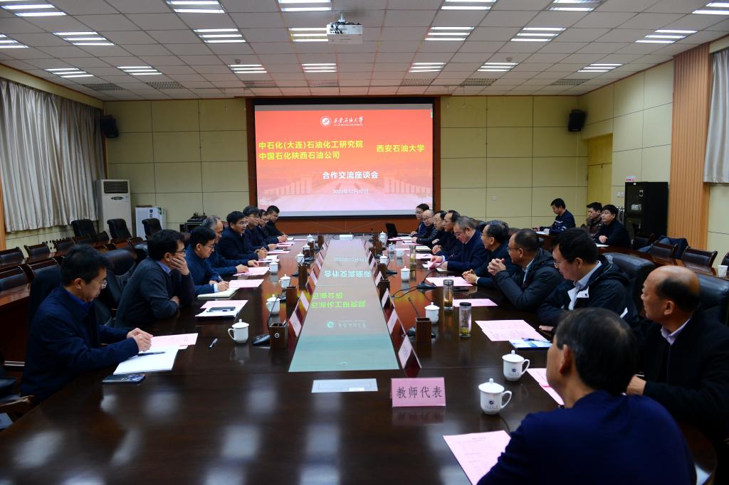 12月12日下午,中國石化(大連)石油化工研究院有限公司院長侯栓弟、黨委副書記吳炳乾,中國石化陜西石油公司黨委副書記李少青一行來校訪問交流。交流座談會在雁塔校區會議中心第一會議室召開。校黨委書記常江、副校長張君濤出席會議。座談會由校黨委副書記張木主持。