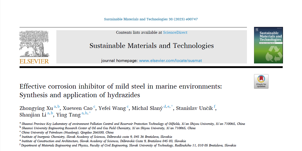 近日,我校與中國石油大學(華東)、斯洛伐克科學院合作在能源環境領域國際權威學術期刊《Sustainable Materials and Technologies》(IF=9.6)發表題為《Effective corrosion inhibitor of mild steel in marine environments: Synthesis and application of hydrazides》的論文。