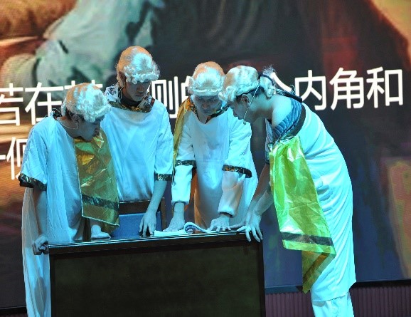 參加展演的16個節目分為課程實踐作品與文藝節目兩大類,來自10個院(系)的一百五十多位同學在舞臺上展示了他們探究數學啟蒙思想、對實際生活中建模的理解、對數學之美的發現。其中有根據數學家故事繪制的“數學漫畫”、有結合數學原理制作的“古代建橋黑科技之超強承重筷子橋”、有用Python編寫的函數動畫;舞臺劇《幾何原本》漫溯歷史長河、探索數學真諦,《王冠的秘密》《田忌賽馬》以夸張幽默的表演再現經典數學故事;小品《數游長安》讓數學問題和文化旅游巧妙碰撞;街舞《數學圖像秀》盡顯青春風采……。