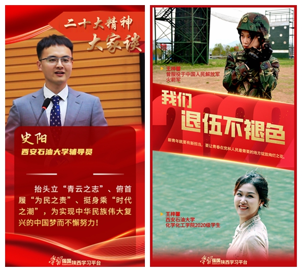 學校主動作為,選派專人擔任“學習強國”陜西學習平臺管理員和通訊員,嚴格按照平臺供稿規范要求積極供稿,確保供稿稿件導向正確、主題契合。踴躍參與“學習強國”陜西學習平臺主辦的“二十大精神大家談”“我們退伍不褪色”等主題征集活動,在更廣領域、更寬范圍講好西石大故事。三年來,“學習強國”陜西學習平臺共采用我校相關稿件100余篇,宣傳部武威獲評2022年度優秀管理員(通訊員)。學校依托“學習強國”平臺強大資源優勢,持續做好理論宣講和思想政治教育工作,不斷調動廣大師生在“學習強國”平臺學習的參與度和積極性。經濟管理學院李春霄獲評2021年度優秀學員,科技處杜永峰2023年受聘基層義務宣傳員。2023年9月,學校開通“學習強國”同學匯,積極發布報道校園動態,多次登上全國高校熱度榜,持續引導廣大學生學好用好同學匯。機械工程學院工業設計系師生設計的“學習強國”聯合文創產品,上架強國商城,成為周年慶的限量產品,廣受好評。