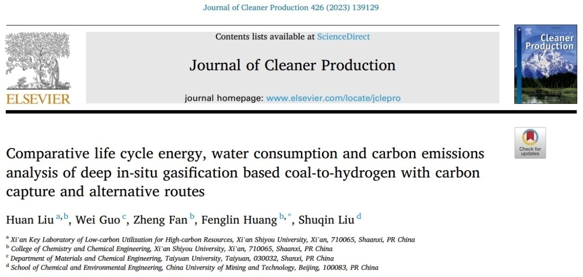 近日,我校化學化工學院黃風林、劉歡科研團隊以劉歡為第一作者、西安石油大學為第一單位在能源環境領域國際權威學術期刊《Journal of Cleaner Production》(JCR、中科院分區雙一區TOP期刊,IF=11.1)上發表題為《Comparative life cycle energy, water consumption and carbon emissions analysis of deep in-situ gasification based coal-to-hydrogen with carbon capture and alternative routes》的高水平論文。