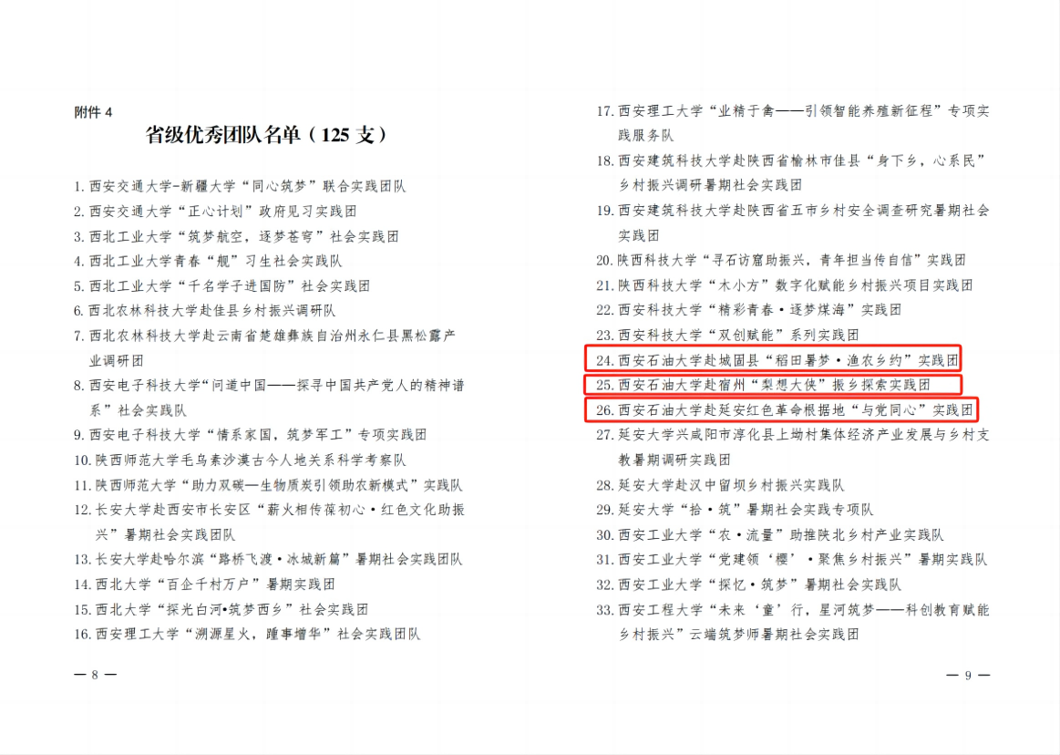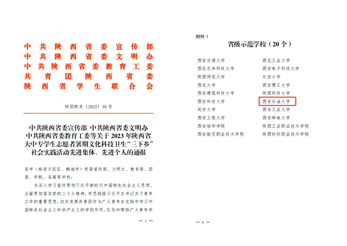 近日,由陜西省委宣傳部、省委文明辦、省委教育工委、團省委、省學聯等單位聯合組織開展的“2023年陜西省大中專學生志愿者暑期文化科技衛生‘三下鄉’社會實踐活動”評選表彰結果揭曉,我校榮獲2023年“三下鄉”活動省級示范學校,地球科學與工程學院“赴城固縣‘稻田暑夢·漁農鄉約’實踐團”、經濟管理學院“赴宿州‘梨想大俠’振鄉探索實踐團”、石油工程學院赴“延安紅色革命根據地‘與黨同心’實踐團”被評為省級優秀團隊。王澤文、宋亞文、劉宇航被評為省級先進個人。經濟管理學院《數商興農背景下農村電商發展影響因素及優化策略調研報告》被評為省級優秀調研報告,并獲團省委專項資助。