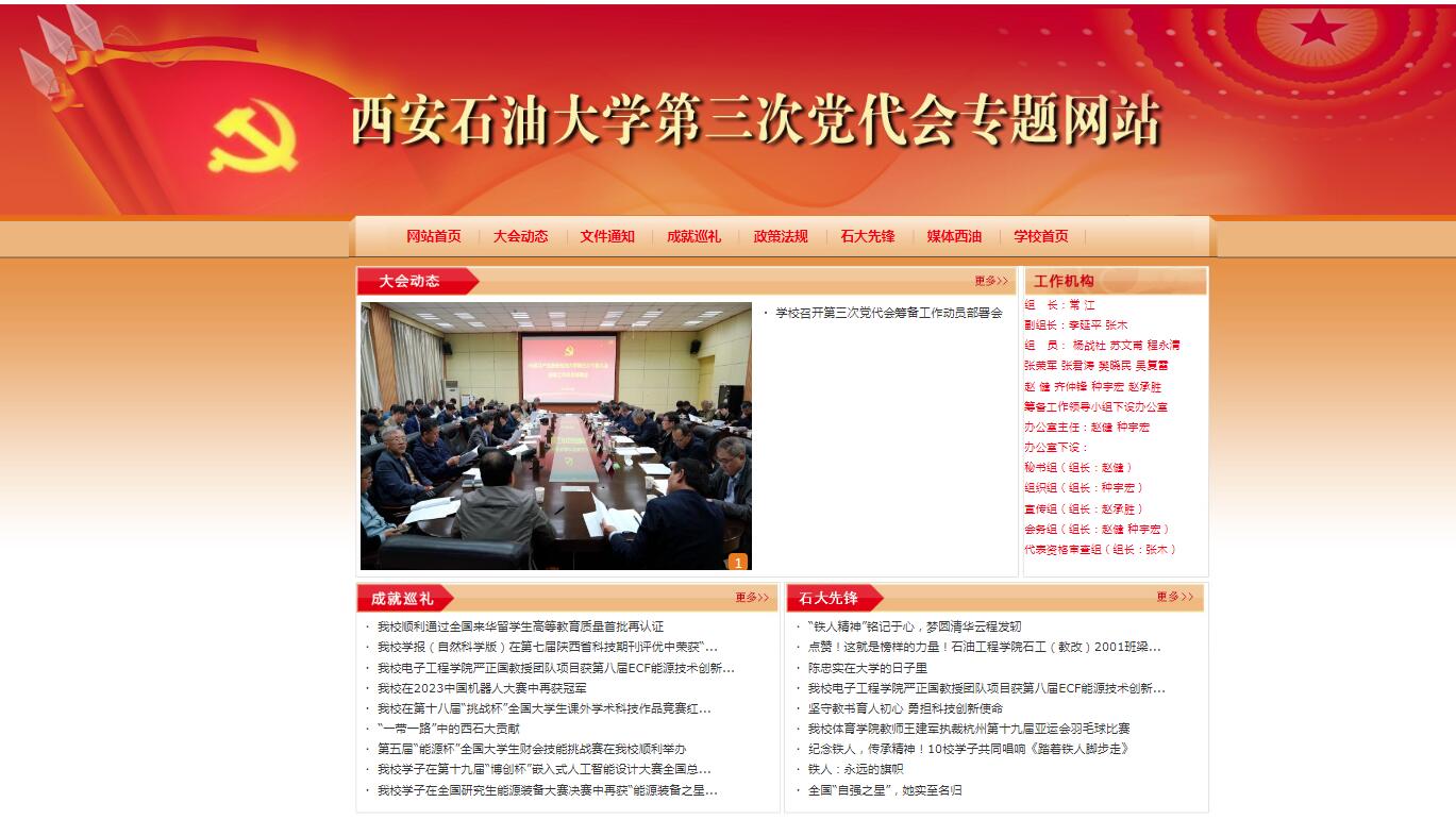 專題網站包括“大會動態”“文件通知”“成就巡禮”“政策法規”“石大先鋒”“媒體西油”等欄目,將集中展示學校第二次黨代會以來黨的建設、教學科研、學風建設、人才培養、管理服務等方面取得的重要成就和寶貴經驗;全面報道我校第三次黨代會的籌備情況和召開盛況;及時反映各基層黨組織迎接黨代會召開以及學習貫徹落實黨代會精神的情況,先進基層黨組織、優秀黨員的典型事跡;全面宣傳本次黨代會制定的學校發展規劃、奮斗目標和主要任務。