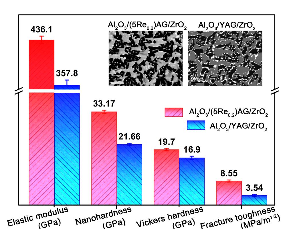 圖1 Al2O3/(5Re0.2)AG/ZrO2和Al2O3/YAG/ZrO2三元共晶復合材料的形貌和力學性能比較