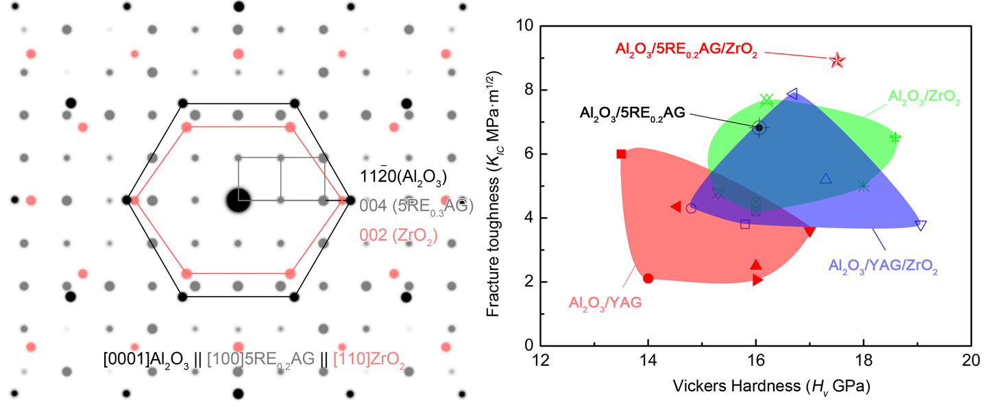 圖2 籽晶法制備Al2O3/(5Re0.2)AG/ZrO2共晶陶瓷的擇優取向和界面關系模擬圖(左圖)和氧化鋁基共晶陶瓷力學性能對比圖(右圖)