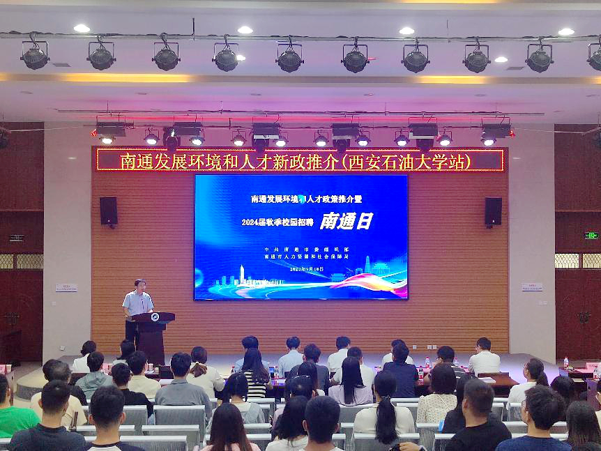 王一鳴代表南通市人力資源和社會保障局,向長期以來給予南通人才發展的學校領導、老師和學生表示衷心的感謝。他表示,西安石油大學是南通市在陜西省建立的第一個高校人才工作站,學校多年來充分發揮引才橋頭堡作用,全力搭建校地對接平臺,促成了西安地區高校與南通在高端紡織、生物醫藥等多個領域的深度合作。當前的南通正處在新一輪跨越發展的黃金機遇期,站上了千載難逢的絕佳“風口期”,南通比以往任何時候都更加需要人才、渴求人才,也比以往任何時候都更有條件吸引人才、成就人才。他真誠地希望大家繼續關心支持南通的發展,積極宣傳推介南通的人才政策和環境。真誠地希望更多的西安石油大學畢業生選擇南通、圓夢南通,共享時代紅利和發展機遇,讓青春之我與未來之城在新時代新征程中同頻共振、綻放華彩。