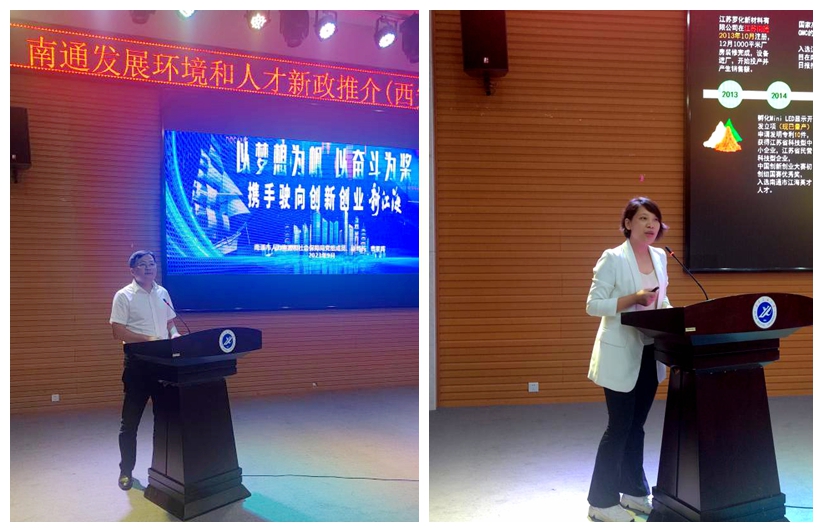 曹星暉代表人力資源和社會保障局作“南通發展環境和人才政策”推介,從產業提質擴量、交通樞紐建設、營商環境優化、城市品質提升、生活品質提升等方面介紹了南通市經濟發展情況和人才新政。江蘇羅化新材料有限公司董事長羅雪方作為企業代表,結合自身創業經歷分享了南通市優質的創業環境和引才留才舉措。