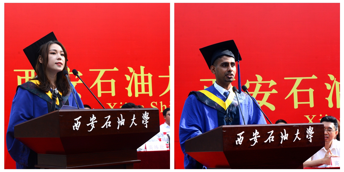 石油工程學院油氣田開發工程專業張洋同學和機械工程學院機械制造及其自動化專業留學生海桑同學分別代表畢業研究生發言,他們分享了研究生階段的成長經歷和收獲,表達了對母校和老師的感恩之情以及立志奮發努力、勇敢前行的信心和勇氣。