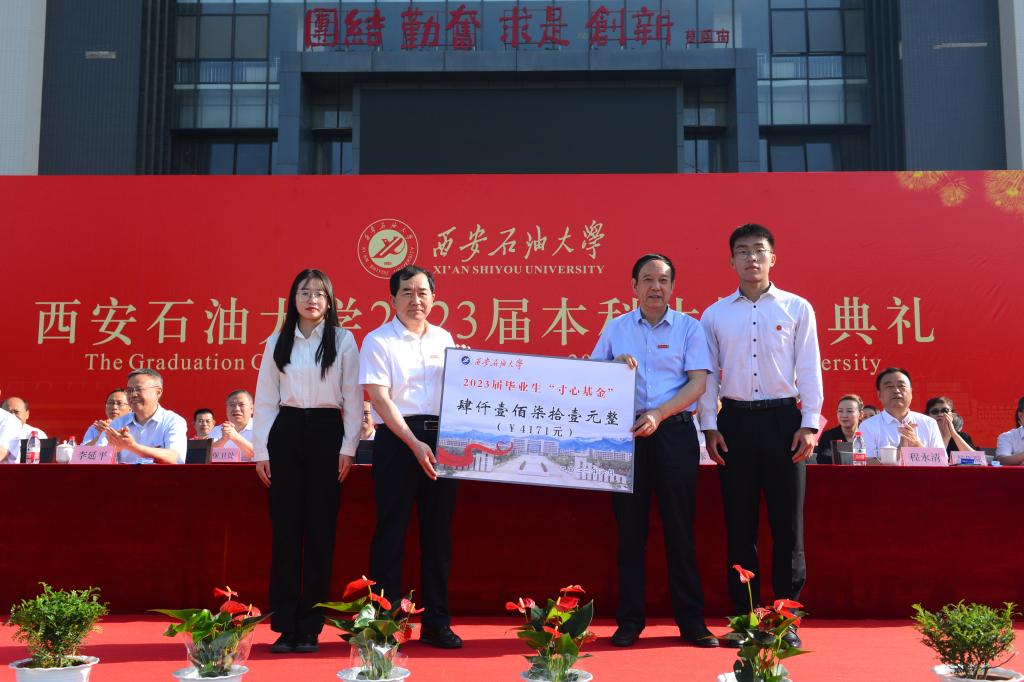 典禮上,校黨委書記賽云秀和校長李天太代表學校接受2023屆本科畢業生“寸心基金”捐款4171元。