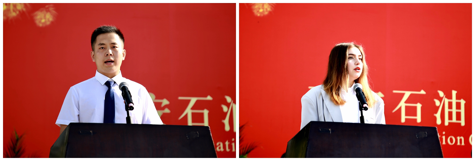 石油工程學院石工(卓越)1901班王志超同學、來自俄羅斯的經濟管理學院電子商務1901班芮娜同學分別代表畢業生和留學生發言。