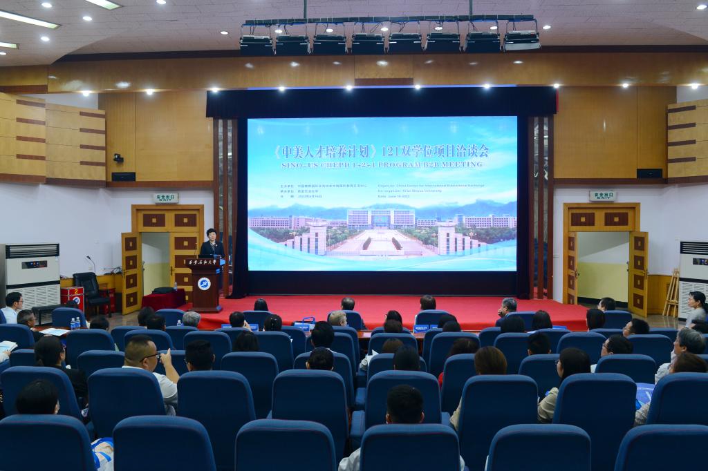 6月16日,由中國教育國際交流協會中教國際教育交流中心主辦,我校承辦的2023年《中美人才培養計劃》121雙學位項目洽談會在我校雁塔校區會議中心學術報告廳舉行。陜西省教育廳二級巡視員董俠,我校副校長張榮軍,中教國際教育交流中心主任張靖、副主任吳琴,美國州立大學與學院學會及美國加州州立大學圣貝納迪諾、美國塞勒姆州立大學等121項目7所美方高校代表,全省27所高校代表,我校國際交流與合作處、教務處、國際教育學院及各院(系)負責人等近百名中外嘉賓出席會議,共商中美教育合作交流大計。