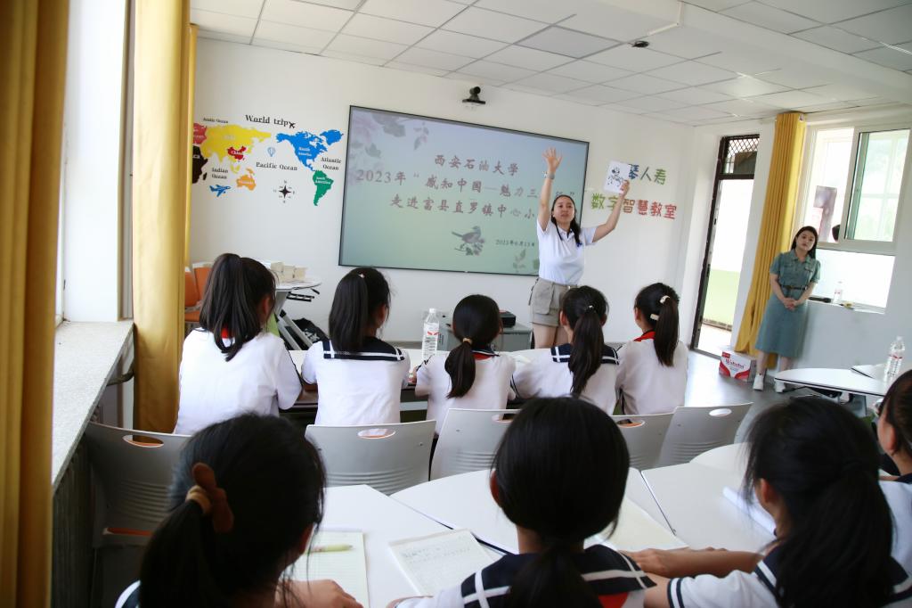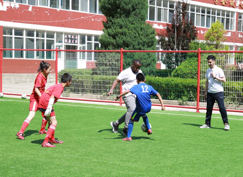 在直羅小學,留學生們為小學生們帶來了有趣生動的英語口語課。實踐教學活動是“感知中國”活動重要組成部分,在互動課堂上,小學生們與來自不同國家的留學生互動交流,來自馬來西亞的詠翰分別用中文、英文、馬來西亞語給小學生們教了生日祝福歌,來自哈薩克斯坦的小云用圖畫、猜謎游戲為小學生們上了一堂生動活潑的英語課。有趣的英語課堂激發了小學生學習英語的熱情和濃厚的興趣,課堂氣氛熱烈,同學們發言踴躍,一節課下來小學生們意猶未盡。英語課堂外,是以“傳播快樂足球”為主題的足球互動活動,留學生與小學生們開展了一場足球友誼賽。場上,參賽隊員們齊心協力,奮勇拼搏。帶球、護球、傳球、射球,動作嫻熟,拼勁十足。就這樣,初次來到直羅小學的留學生們感受到了當地的風土人情,并對接下來與孩子們的相遇充滿了期待。活動中,我校專程為直羅小學帶去了50本捐贈圖書和5個嶄新足球。