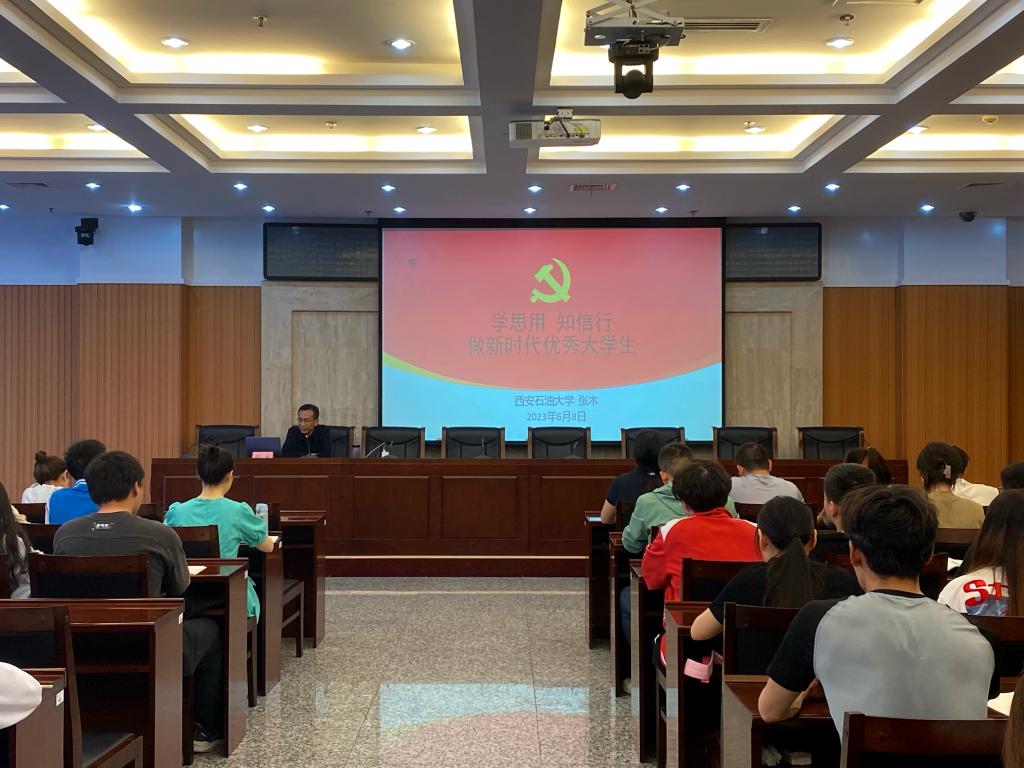 6月8日下午,校黨委副書記張木在鄠邑校區圖書館第一會議室講授了題為《學思用知信行做新時代優秀大學生》的學習貫徹習近平新時代中國特色社會主義思想主題教育專題黨課。學生工作部負責人、部分學工干部、各院(系)學生黨員代表90余人參加了黨課學習。此次專題黨課由學生工作部部長王亮主持。