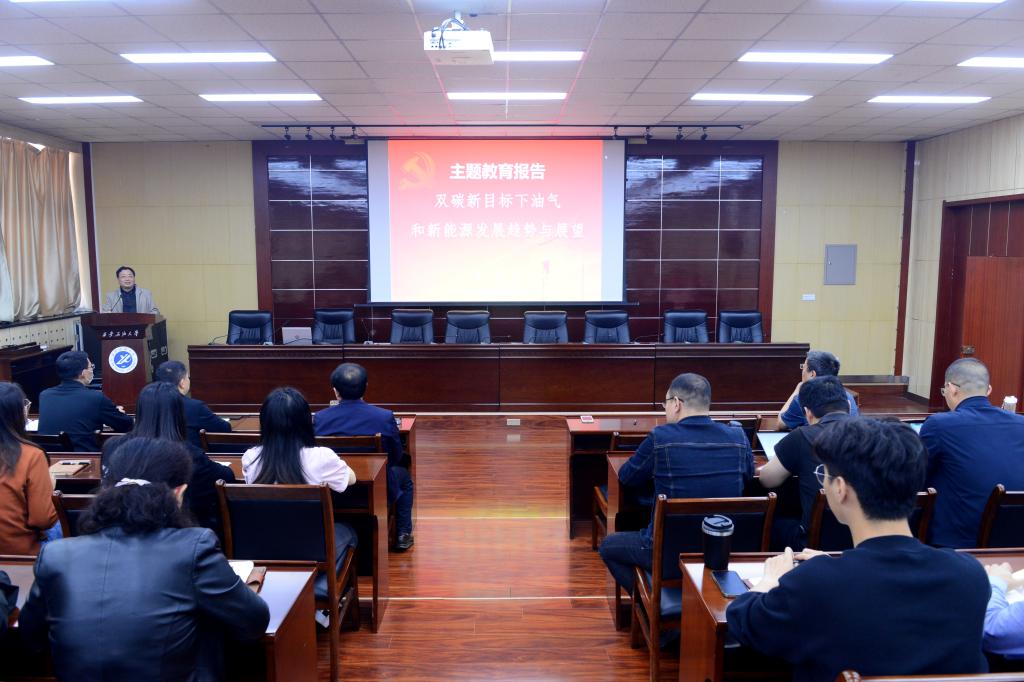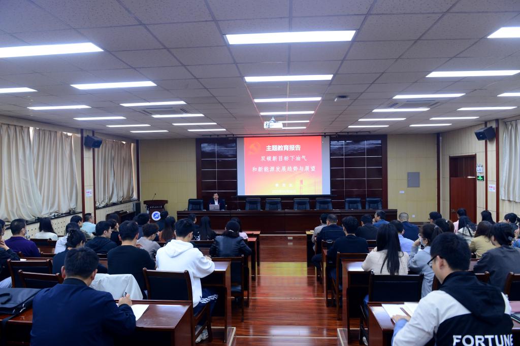 李天太在講授中強調了本次學習貫徹習近平新時代中國特色社會主義思想主題教育的總要求、根本任務、5個目標、著力解決6個方面突出問題,并從雙碳新目標、世界油氣發展趨勢、我國油氣發展趨勢、石油天然氣勘探開發關鍵技術和新能源發展展望五個方面出發,指出當前我國正處于實現“雙碳”目標、構建“清潔低碳、安全高效”能源體系的關鍵時期,做好“碳達峰、碳中和”工作要加快調整優化產業結構、能源結構。我校作為以石油石化為特色的多科性普通高等學校,要深刻把握新能源技術發展水平與趨勢,始終推進學校向高水平教學研究型大學邁進,持續強化和拓展學校優勢學科領域、落實“雙一流”建設,堅持立德樹人根本任務,堅持科技創新“四個面向”,著力培養“三和”+“三碳”人才,服務于國家能源建設。