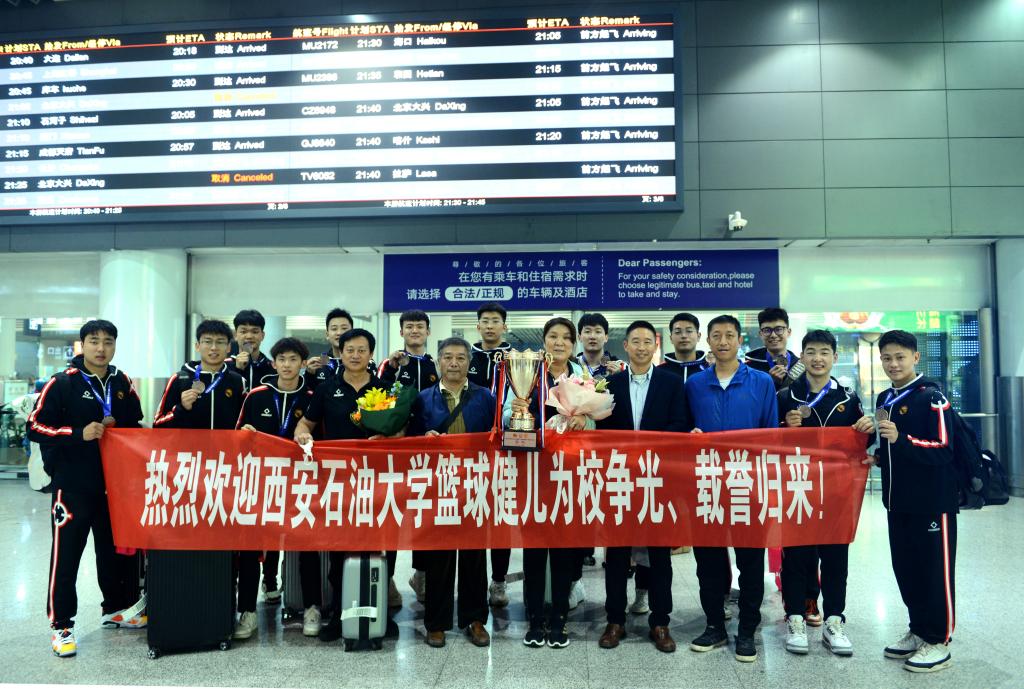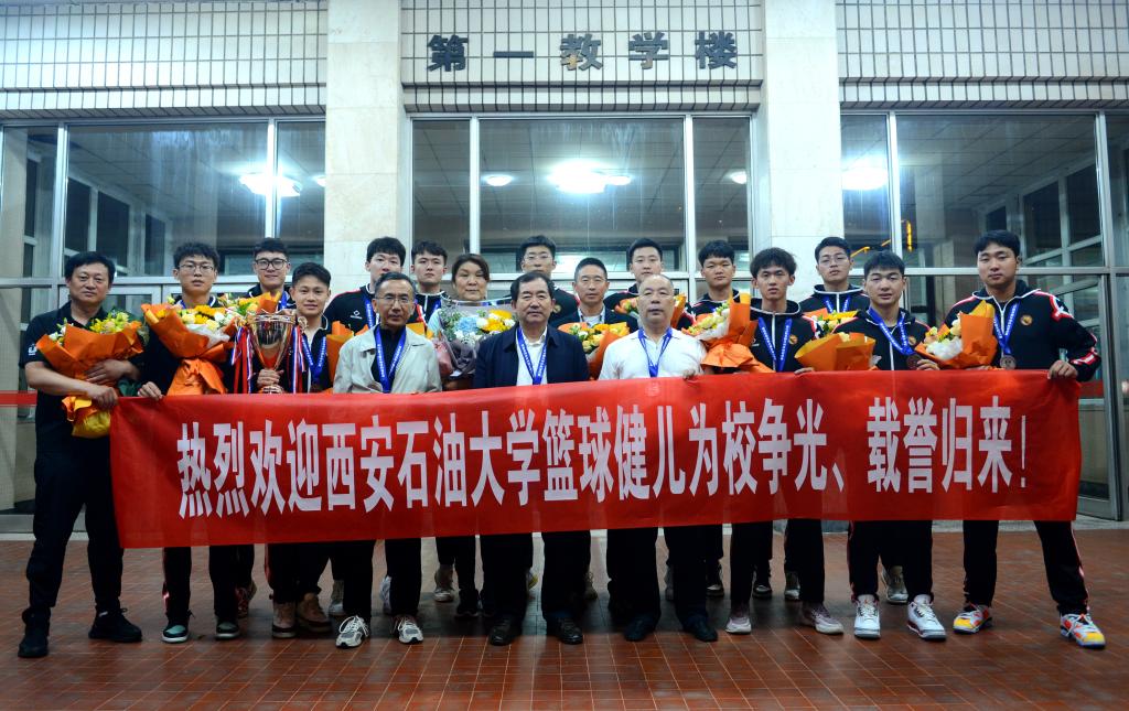 據悉,當天下午,體育學院倪振文、李壽邦一行前往西安咸陽國際機場接機,晚上10:20左右接機大巴車到達雁塔校區?!盁崃覛g迎西安石油大學籃球健兒為校爭光、載譽歸來!”歡迎儀式從隊員下車開始,獻花隊伍為每名教練組成員和隊員獻上鮮花。