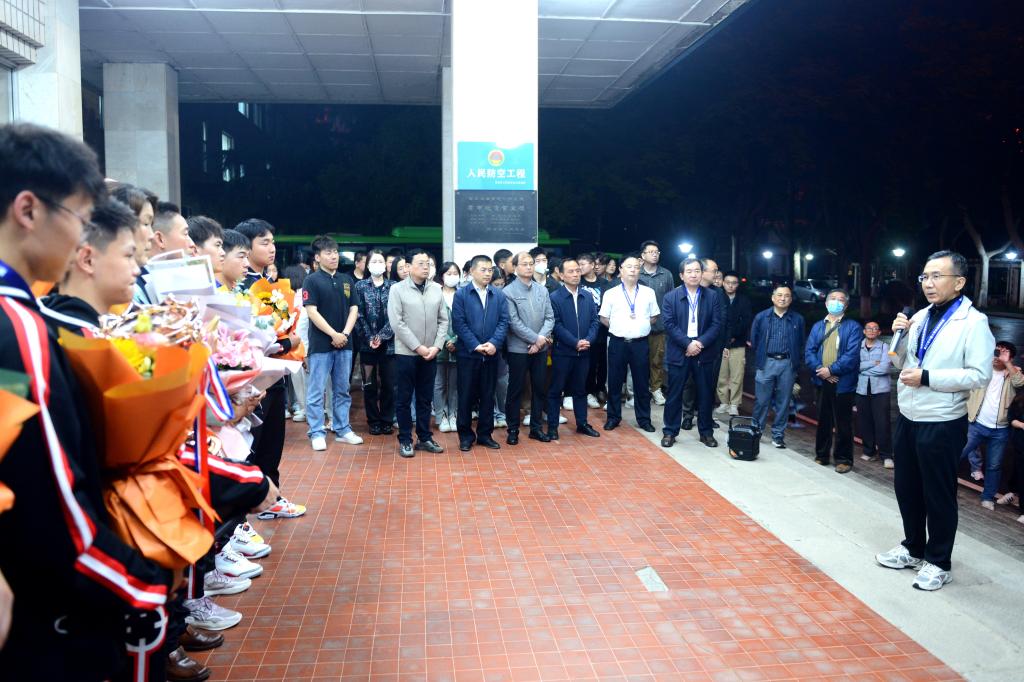 歡迎儀式上,李天太致辭。他首先感謝體育學院精心組織和安排,感謝教練組全體老師的辛勤工作和付出,感謝全體隊員發揚鐵人精神再創輝煌,感謝所有相關學院和各部門對球隊給予幫助和支持。其次他對我校近年來的體育工作表示充分肯定,對我校在本次比賽中取得優異成績獲得較大的社會影響力表示肯定。最后他希望大家再接再厲,再創輝煌。