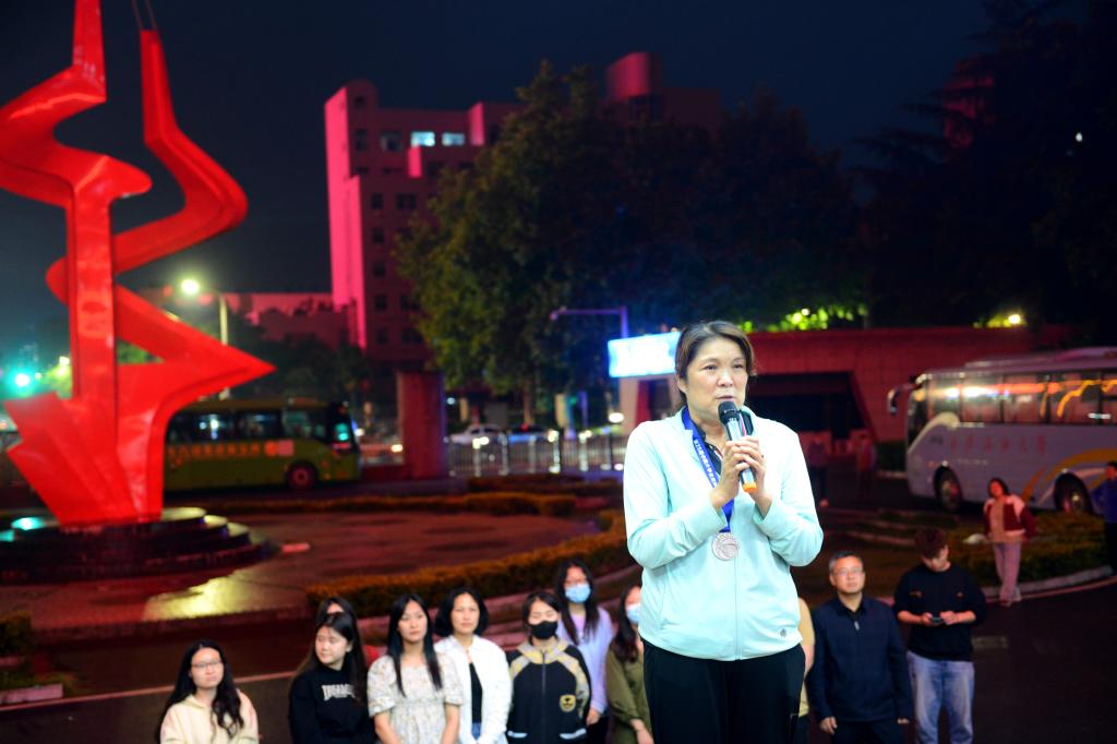 主教練秦香代表球隊教練組發言。她表示,對學校組織的歡迎儀式感到無比榮耀,對多年來給予籃球隊大力支持的各級領導和部門表示感謝。她回憶起多年執教之路,感慨萬千,泣不成聲,同時希望隊員們再接再厲,更加進步。隨后秦香為李天太、張木、陳軍斌三位校領導贈送本屆比賽季軍獎牌。