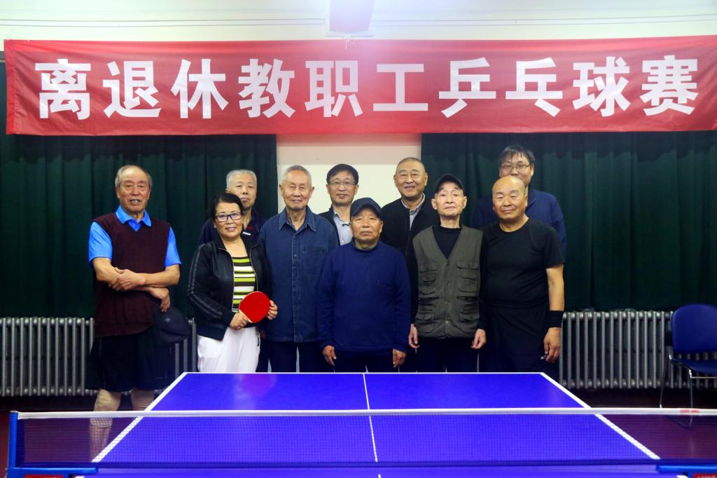 調研結束后,蘇文甫為離退休教職工乒乓球比賽的獲獎者頒獎并合影留念。