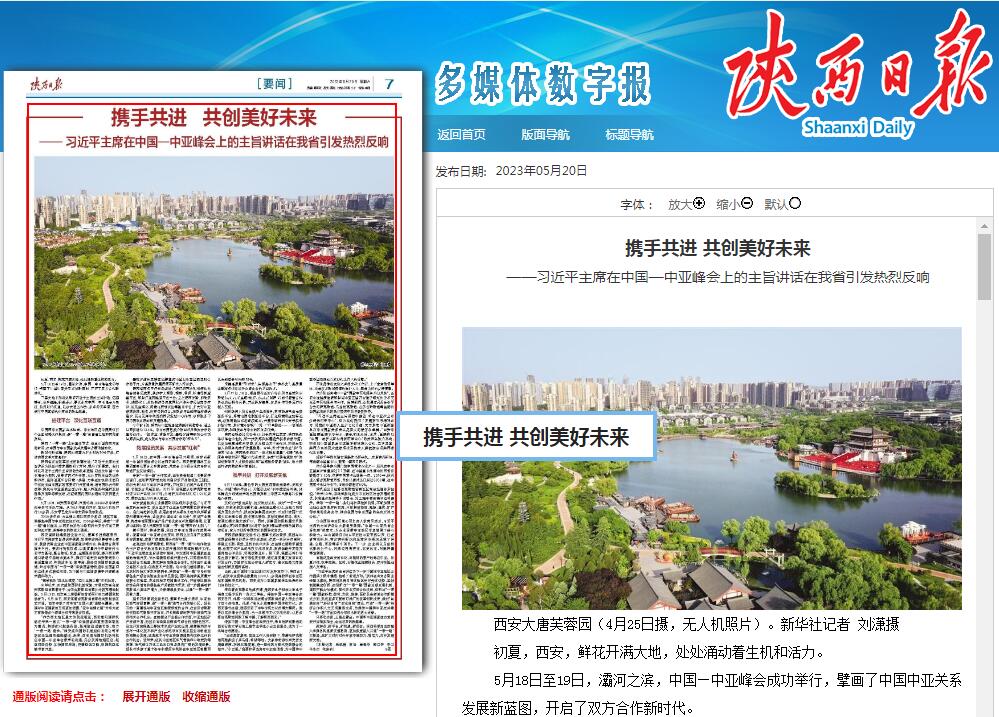《陜西日報》之《攜手共進 共創美好未來——習近平主席在中國—中亞峰會上的主旨講話在我省引發熱烈反響》鏈接:https://esb.sxdaily.com.cn/pc/content/202305/20/content_809583.html