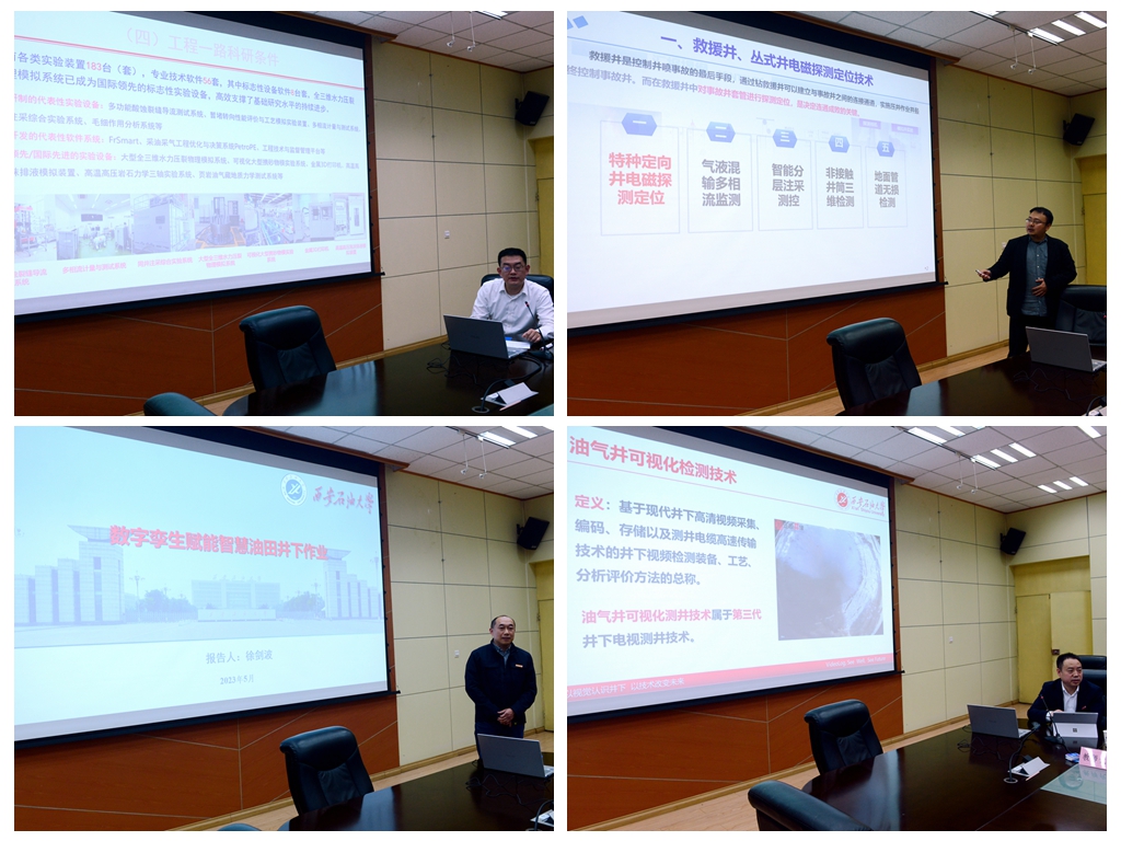 會上,勘探院工程業務部綜合辦主任李濤介紹了勘探院的基本情況以及工程一路的組織架構和取得的主要業績。我校嚴正國、黨博、徐劍波分別匯報了所在團隊的研究成果、核心技術和推廣應用情況。隨后,與會人員圍繞勘探開發領域的相關技術和合作方向進行了深入交流和探討。