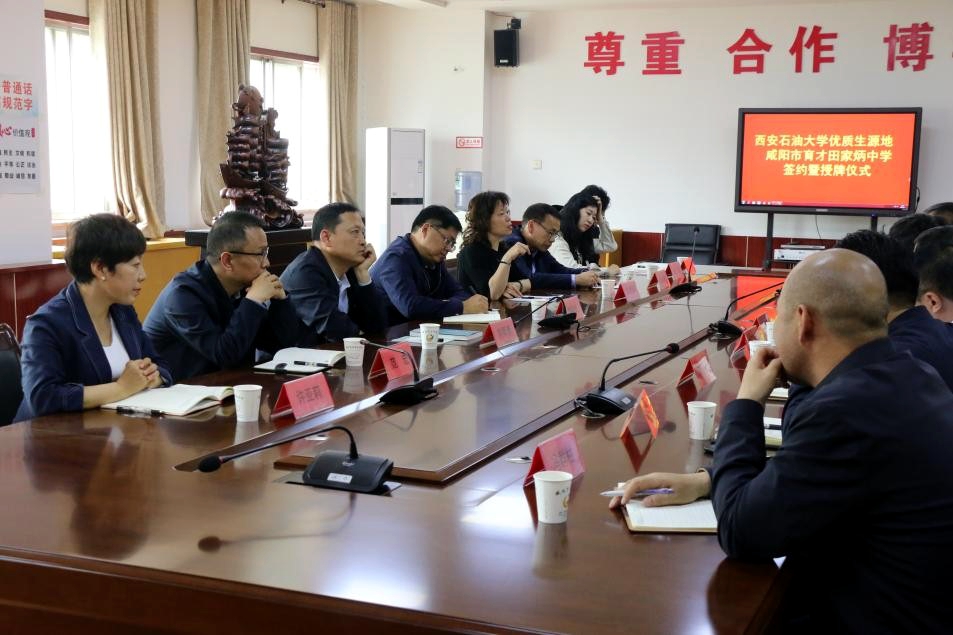 會上,雙方簽訂了“西安石油大學優秀生源基地”協議書,王君萍代表學校向咸陽市育才田家炳中學授牌。