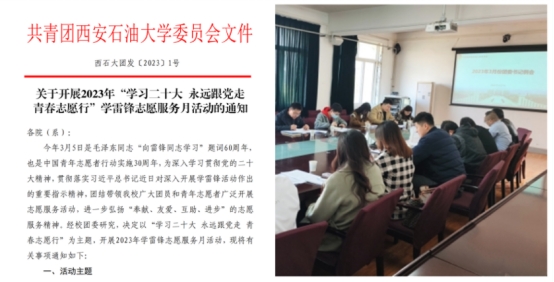 一是發揮共青團的組織優勢,面向全校青年學生發布《關于開展2023年“學習二十大 永遠跟黨走 青春志愿行”學雷鋒志愿服務月活動的通知》,在學校各級團組織集中開展為期一個月的“學雷鋒”志愿服務活動,活動范圍覆蓋關愛留守兒童、鄉村振興、助殘助老、生態環保、文明校園等方面。二是理論聯系實際,推動工作提質增效,組織各院系團委書記、團支部書記學習習近平總書記對深入開展學雷鋒活動的重要指示精神,并結合實際對在我校如何推進“學雷鋒”志愿服務工作取得實效進行了研討和工作部署。三是推進志愿服務工作組織規范化建設,推薦教師和學生代表參加3月25日舉行的陜西省青年志愿者協會第五次會員代表大會,推薦我校青年志愿者協會入選“陜西省青年志愿者協會理事單位”。