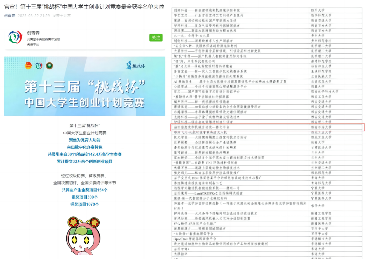 3月17日至19日,第十三屆“挑戰杯”中國大學生創業計劃競賽終審決賽在北京理工大學舉行。經過校賽、省賽和國賽角逐,由我校聶向榮、張榮軍、趙凱、楊懿老師指導,石工教改2001班梁歡同學負責的《油田信息化和機械自動化一體化平臺》項目,榮獲科技創新與未來產業組別國家級銅獎。