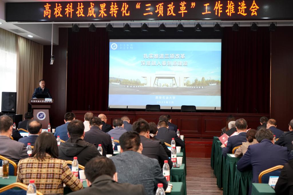 會上,西北工業大學、西安理工大學、西安建筑科技大學、陜西科技大學、西安石油大學等5所高校作了交流發言。張榮軍代表我校致歡迎辭,并匯報了我??萍汲晒D化“三項改革”推進情況和取得的成效。