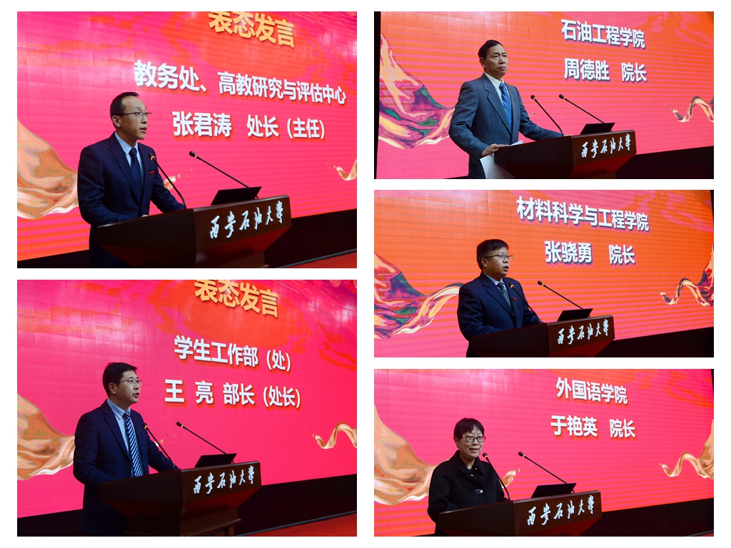 教務處、學生工作部、石油工程學院、材料科學與工程學院、外國語學院主要負責人分別代表各職能部門和院(系)發言,他們表示將積極組織單位全體師生深入學習新一輪本科教育教學審核評估方案和要求,按照學校審核評估工作方案要求和此次本科教育教學審核評估工作部署推進會會議精神,做好各項工作安排部署,全面落實立德樹人根本任務,保質保量按時完成各項審核評估工作。