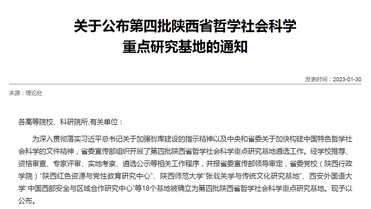 近日,省委宣傳部發布了《關于公布第四批陜西省哲學社會科學重點研究基地的通知》,我校馬克思主義學院牽頭申報的“鐵人精神研究中心”被確立為第四批陜西省哲學社會科學重點研究基地。