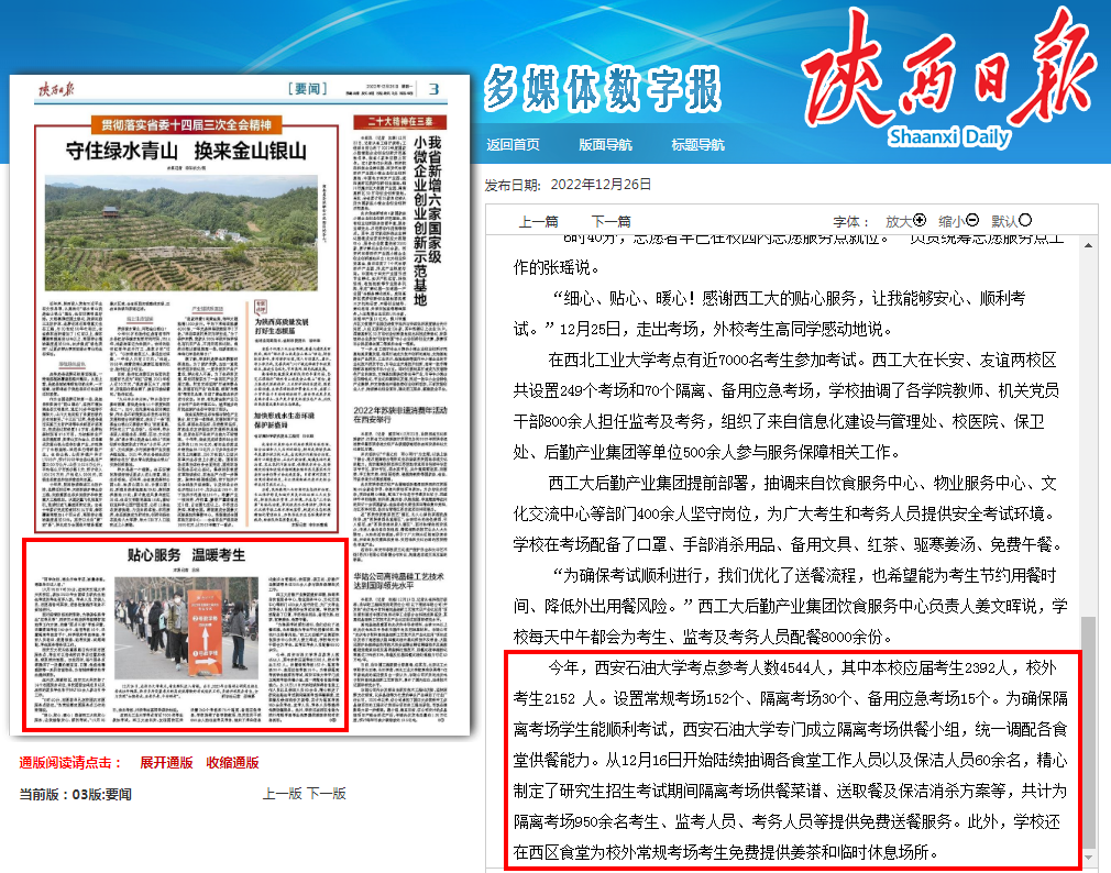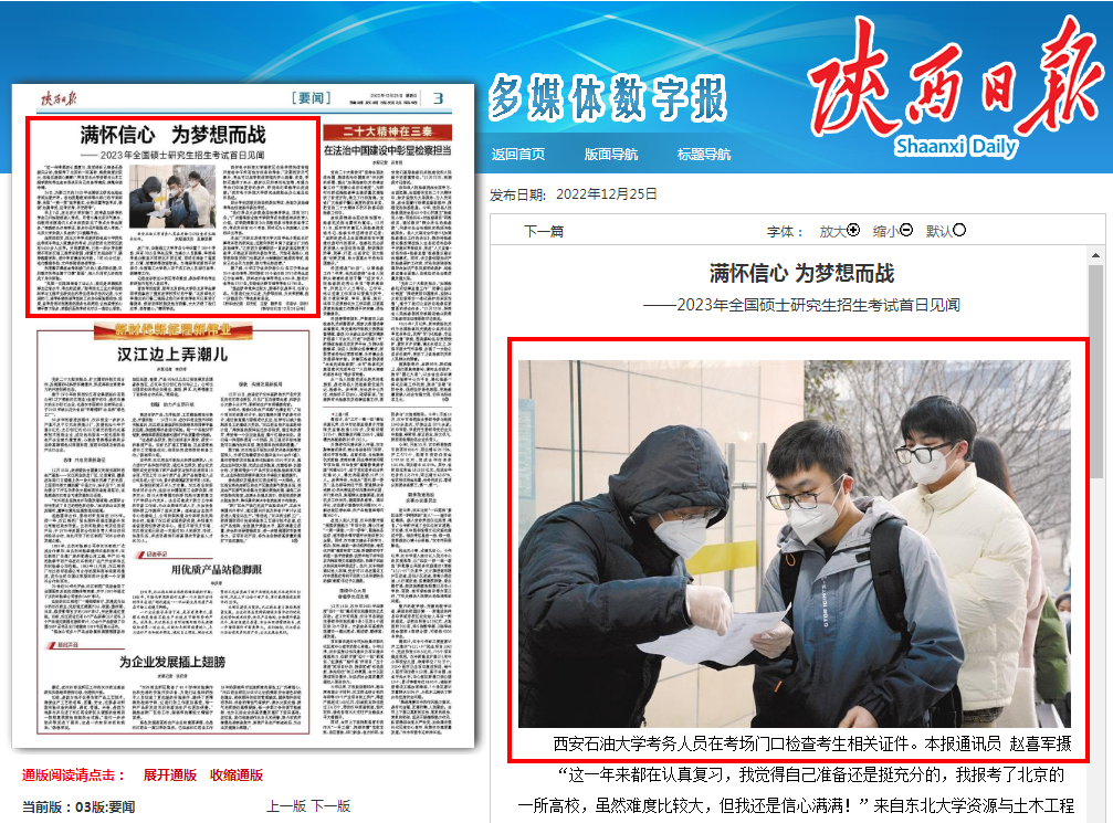 學校研究生招生考試得到了陜西日報、陜西廣播電視臺、“學習強國”陜西學習平臺、澎湃新聞、華商報、陜西省教育廳官微等省級主流媒體和上級部門的多次報道,其中,12月25日、26日,陜西日報兩次報道學??紕展ぷ鳎〉昧溯^好的社會反響。
