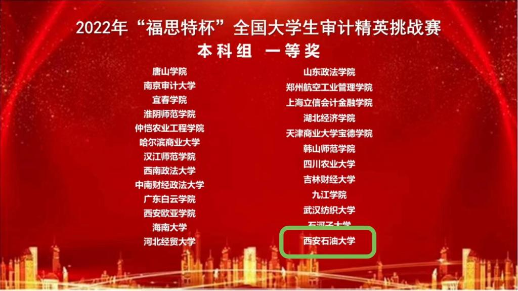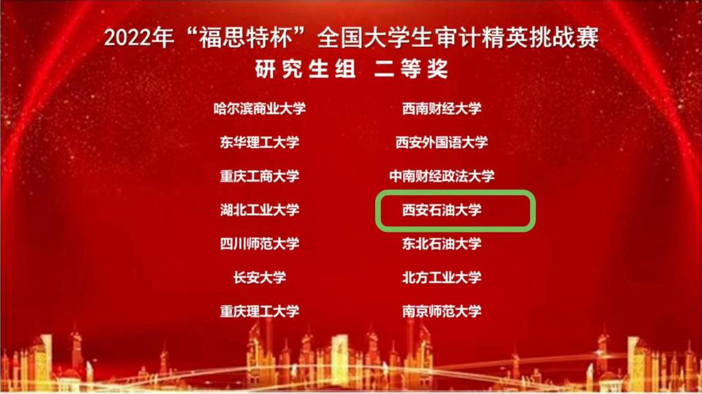 本次比賽采用線上的方式進行,來自西南財經大學、南京審計大學、中南財經政法大學、上海立信會計金融學院、東北石油大學等340所院校的390支隊伍參加了本次比賽,1800余名師生同臺競技,其中研究生組72支代表隊,本科組258支代表隊,高職組60支代表隊。我校經濟管理學院會計系黃莉老師指導的2019級本科生李文文、吳珊珊、李洋獲得本科生組一等獎,黃莉、侯曉靖老師指導的2022級研究生王萍、王嚴、白玉獲得研究生組二等獎,為我校參加該項賽事以來取得的最好成績。