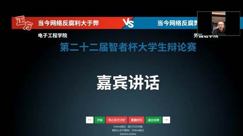 電子工程學院和外國語學院兩支代表隊以“網絡反腐,利大于弊”還是“網絡反腐,弊大于利”進行了緊張而激烈的辯論。辯論雙方理論清晰、旁征博引、思辯敏捷、邏輯嚴密、你來我往、精彩紛呈,為我們呈現了一場高水平的辯論賽。最終,電子工程學院獲得第二十二屆“智者杯”大學生辯論賽冠軍,外國語學院獲得亞軍。馬克思主義學院教師朱銀全代表評委團對本場決賽作了點評。