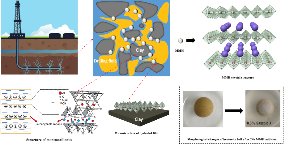 實驗表明,多種M-MMH具有強抑制作用,線性膨脹較4%KCl溶液中降低70%以上。進而對M-MMH漿作為鉆井液基漿的性能進行了評價,發現M-MMH漿具有低粘度和高切力的特點。在200℃下老化16小時后,其粘度和動塑比穩定,表明其作為基漿具有很強的提高熱穩定性作用。目前正在進行抗250℃水基鉆井液材料的研究,并且將基于該材料進一步開展具有抗高溫和強攜巖能力水基鉆井液體系研究,以解決我國高溫、超深鉆井液的技術需求。(Nanomaterials2022, 12, 3863.論文鏈接https://doi.org/10.3390/nano12213863)