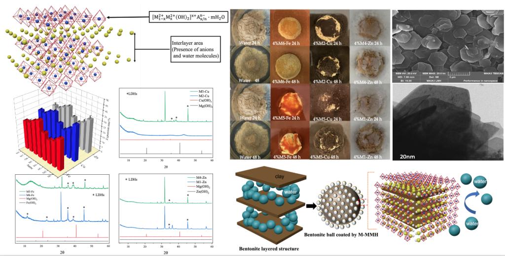 該插層聚合物仍存在許多不足,比如造漿能力不強和攜巖性差。為了解決這些問題,該課題組通過引入Cu、Fe、Zn等離子制備多元插層聚合物(M-MMH),評價了其抑制粘土分散的作用,并研究了其作為抗高溫鉆井液基漿組分的可能性,如圖3所示。