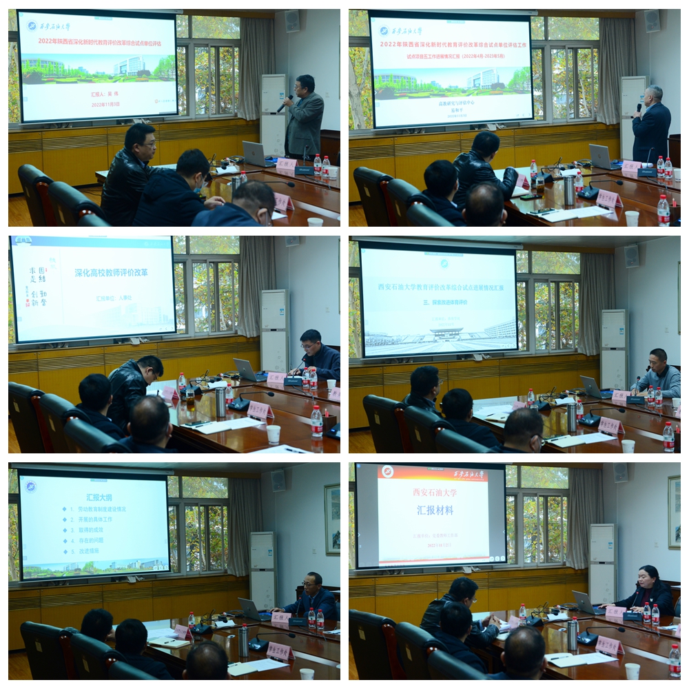 近日,中共陜西省委教育工作領導小組對全省深化新時代教育評價改革綜合試點單位的工作推進情況開展督導評估。11月3日下午,我校作為綜合試點單位,接受了以陜西師范大學副校長楊祖培教授為組長的高等教育第一專家組的在線督導評估。此次評估工作的線下會場設在雁塔校區行政樓五樓會議室,副校長陳軍斌主持會議,高教研究與評估中心、教務處、人事處、教師工作部等職能部門和相關學院負責人參加了評估會議。