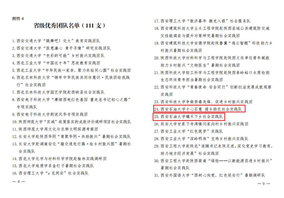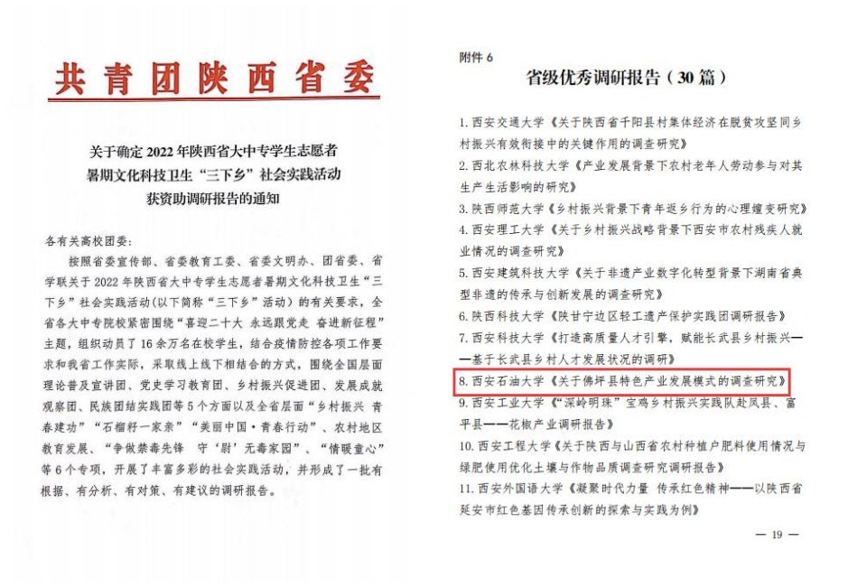 近日,由陜西省委宣傳部、省委文明辦、省委教育工委、團省委、省學聯等單位聯合組織開展的“2022年陜西省大中專學生志愿者暑期文化科技衛生‘三下鄉’社會實踐活動”評選表彰結果揭曉,我校榮獲2022年“三下鄉”活動省級優秀組織單位,地球科學與工程學院“十心石意援鄉助農”社會實踐隊,電子工程學院“曦禾下鄉”社會實踐隊被評為省級優秀團隊。王瑩、李政被評為省級先進個人。地球科學與工程學院《關于佛坪縣特色產業發展模式的調查研究》調研報告獲團省委專項資助。
