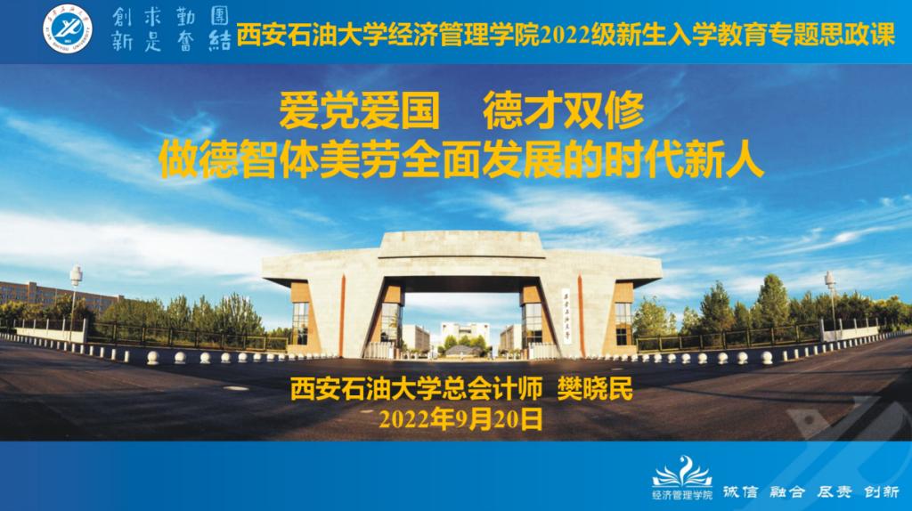 為幫助新生入學后盡快融入校園環境、積極面對大學生活、全身心投入專業學習,順利實現角色轉變,引導學生努力成長為社會主義合格建設者和可靠接班人而奮斗,9月20日,總會計師樊曉民以《愛黨愛國,德才雙修,做德智體美勞全面發展的時代新人》為題,圍繞文化知識教育、愛國主義教育、思想品德教育和理想信念教育等方面內容,用深入淺出的理論講解、圖文并茂的案例分析和生動形象的個人經歷為經濟管理學院2022級新生講授專題思政課。