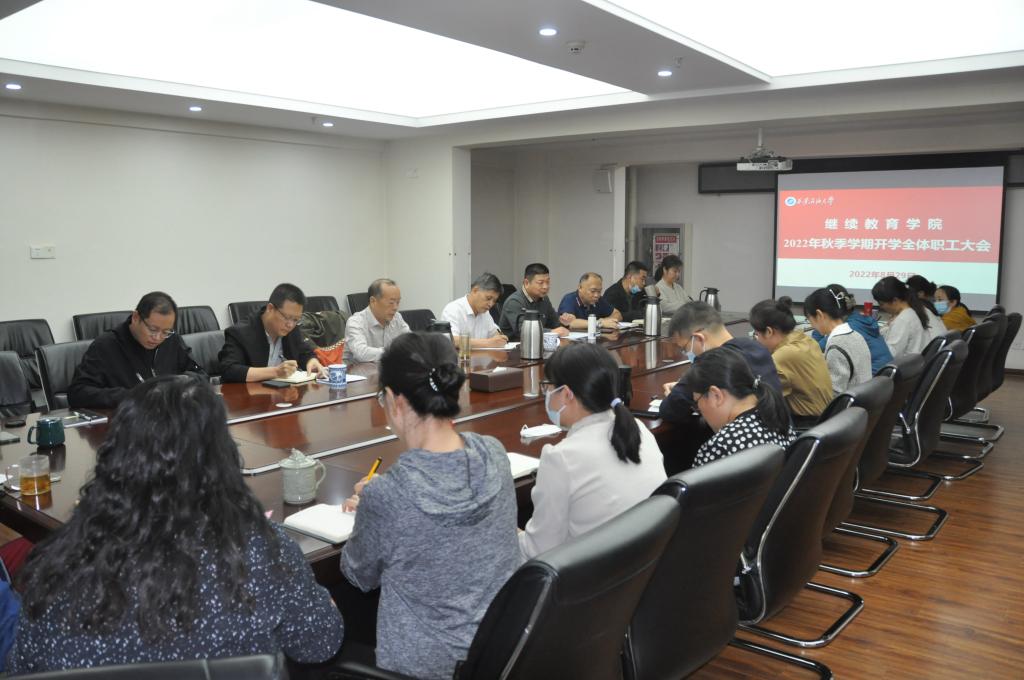 8月29日下午,繼續教育學院召開新學期職工大會,總結暑期工作,部署新學期工作。副校長楊戰社出席會議,繼續教育學院黨總支書記耿嶺主持會議。