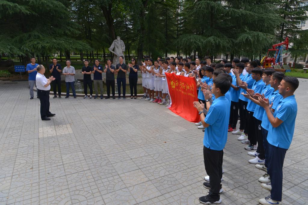 代表團副團長、體育學院院長李壽邦帶領大家進行出征宣誓,并向所有參加本次賽事的教練、工作人員、隊員提出嚴格要求。要求大家嚴格賽風賽紀,遵守比賽規則和賽場紀律,服從裁判,尊重對手,團結協作,公平競爭,發揚西石大“鐵人”精神,拿出“鐵人”意志,頑強拼搏,賽出風格,賽出水平!