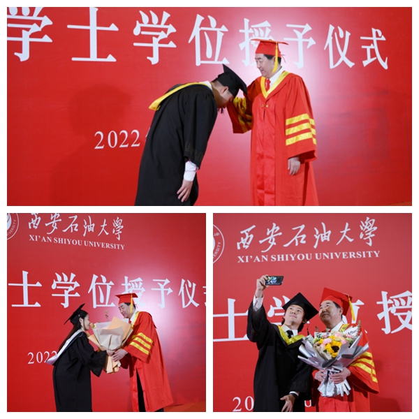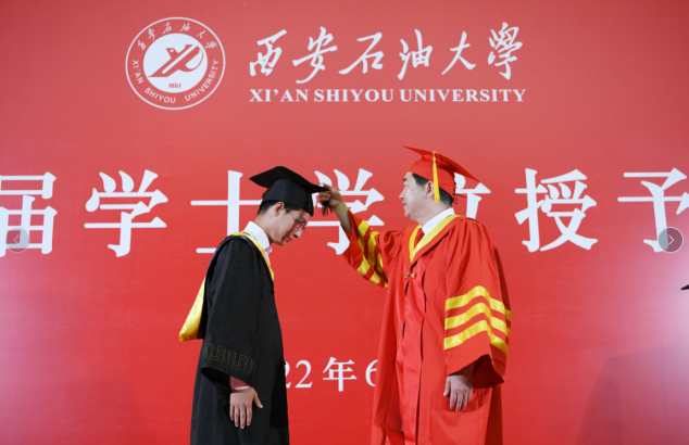 6月27日上午,西安石油大學2022屆優秀畢業生代表學士學位授予儀式在鄠邑校區弘石學術報告廳隆重舉行。校長、校學位評定委員會主席李天太,副校長、校學位評定委員會副主席陳軍斌出席學士學位授予儀式。學士學位授予儀式由校黨委副書記、校學位評定委員會副主席張木主持。鄠邑校區管理辦公室、學生工作處、教務處等相關職能部門負責人、各院(系)負責人、208名優秀畢業生代表參加授位儀式。