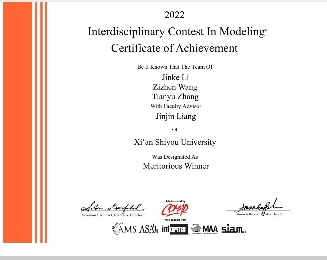 日前,2022年美國大學生數學建模競賽落下帷幕。在這次比賽中,我校學生李金科、王子禛、張天雨在理學院教師梁錦錦的指導下,不負眾望,以優異的表現喜獲一等獎(M獎,Meritorious Winner)。