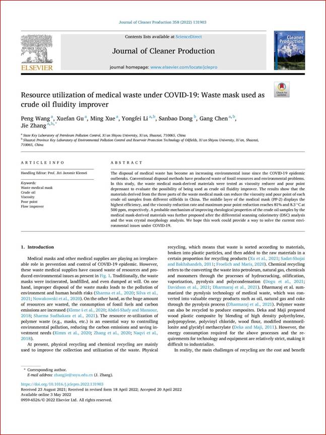 該項研究工作近期以“Resource utilization of medical waste under COVID-19: Waste mask used as crude oil fluidity improver”為題發表在Journal of Cleaner Production(中科院一區,TOP期刊,2021年IF=9.297)期刊上。張潔教授和顧雪凡教授共同指導,碩士研究生王棚為論文第一作者,張潔教授為通訊作者,西安石油大學為第一單位。
