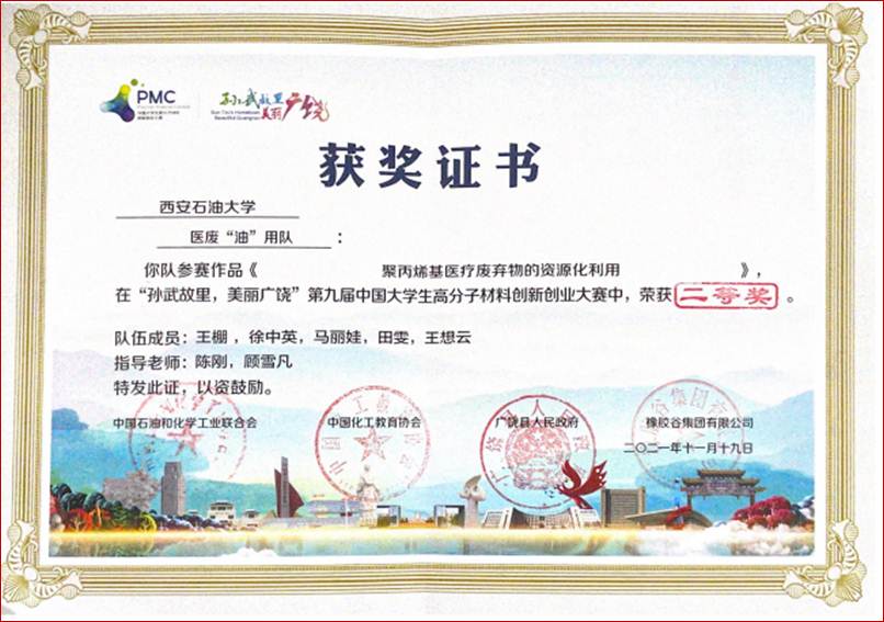 基于該課題的研究工作,已經先后獲得第十四屆全國大學生節能減排社會實踐與科技競賽三等獎、第九屆中國大學生高分子材料創新創業大賽二等獎。