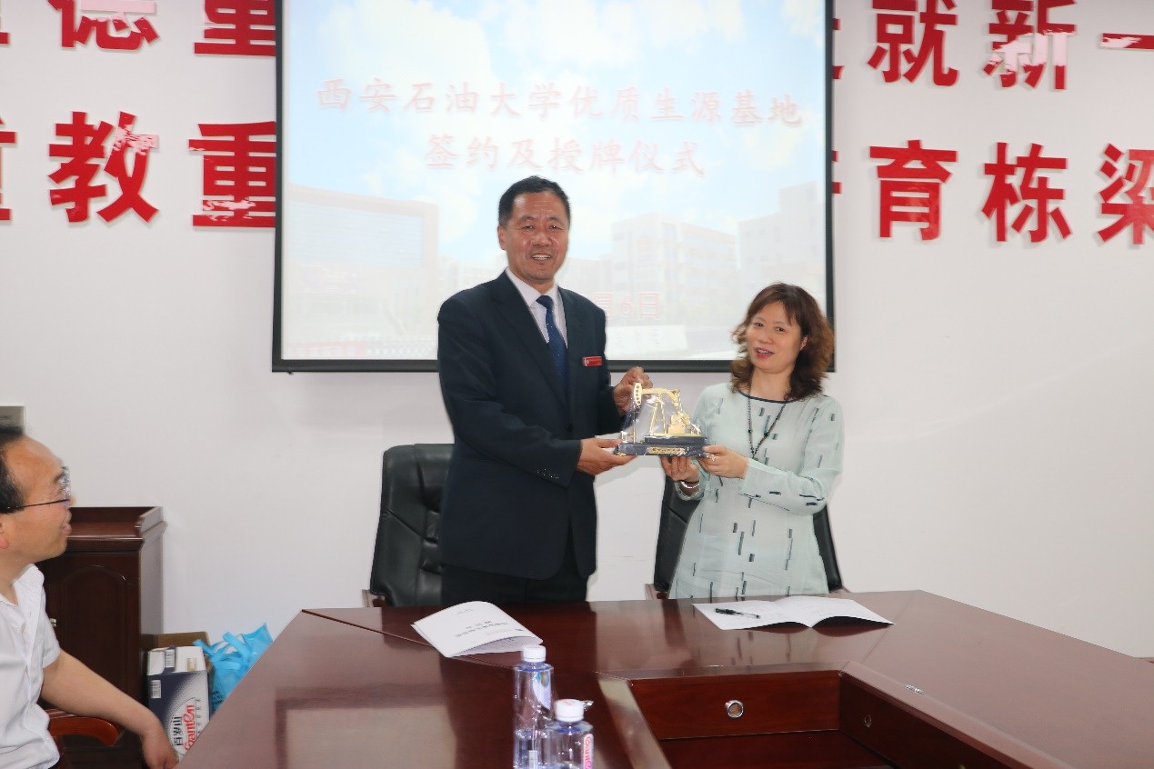 會上,雙方簽訂了“西安石油大學優秀生源基地”協議書,王君萍代表學校向合陽縣第二高級中學授牌。