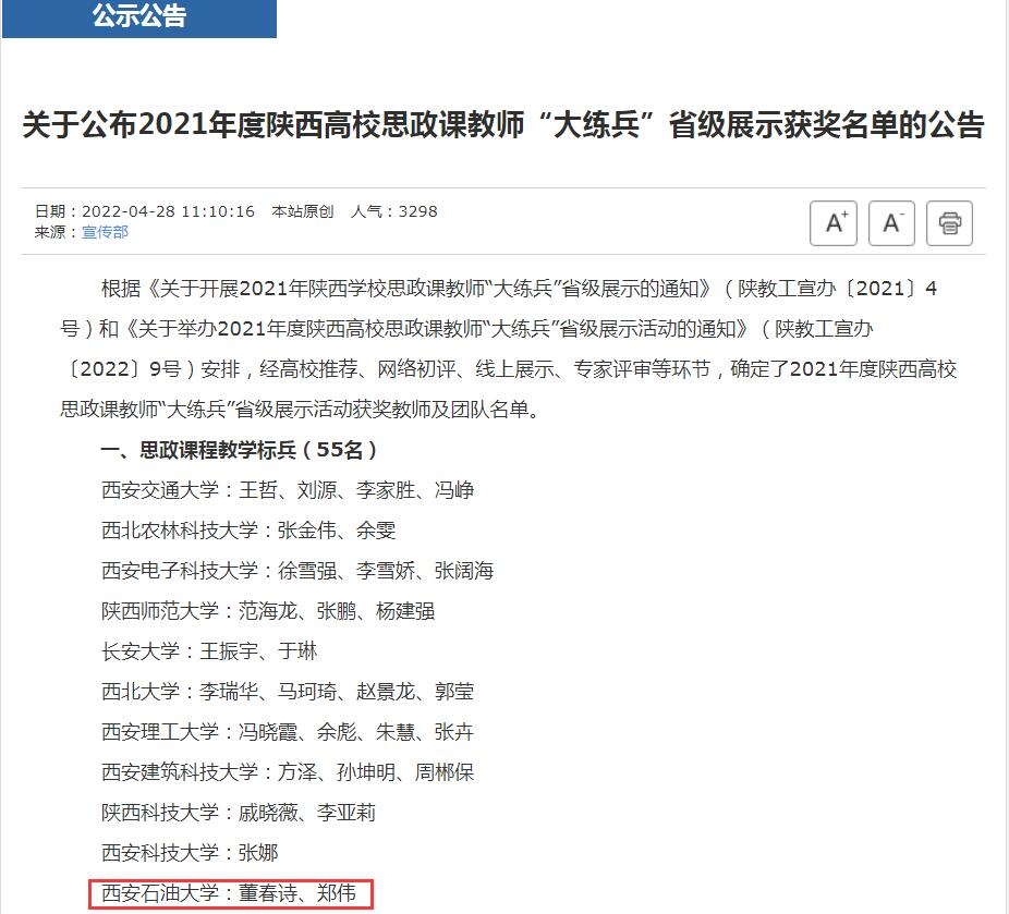 2021年度陜西高校思政課教師“大練兵”省級展示活動獲獎名單于4月28日公布,我校馬克思主義學院教師董春詩、鄭偉獲得思政課程教學標兵稱號,張莉、王婉菲獲得思政課教學團隊標兵稱號,孟曉蕾獲得思政課程教學能手稱號。